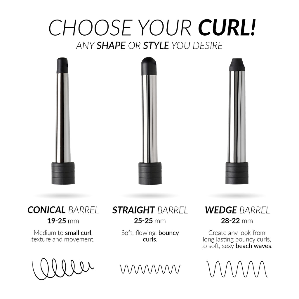 THREE barrel sizes to create limitless styling options: 19-25mm, 25-25mm, 28-22mm wedge, Barrels finished in super smooth titanium for smooth, static free curls and shine. Titanium provides a dry heat with instant results.